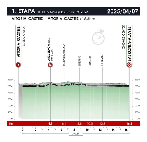 We love a good time trial on day one! The course is 16.5 kilometers from Vitoria-Gasteiz to Baskonia Alavés. It is a time trial with one third-category climb, although, at 900 meters at 2.4 percent, it hardly qualifies as such. A nice little loop has been laid out, so there are no long, straight roads back to the starting point. However, it is not very technical, with only a few right-angled turns. Great for the specialists!