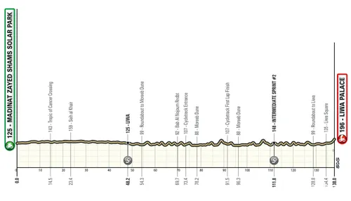 According to the organizers, the final meters of the stage feature an average gradient of 5%, following a route that mostly consists of wide, smooth, and straight roads leading into the finale. The stage starts from Madinat Zayed Shams Solar Park. In theory, this should still be manageable for the sprinters, but don’t be surprised if a few punchy riders—who usually lack the raw watts for a flat sprint—seize the opportunity here.