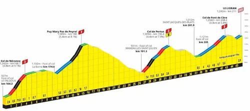 After that, the route keeps going a bit up and down, but from roughly 75 kilometers from the finish, it is mainly uphill. From Ydes, about five hundred meters of elevation need to be conquered towards Le Fagoux, where the tough Col de Neronne (3.8 kilometers at 9.1 percent) looms. There is not much time to recover, as the Puy Mary Pas de Peyrol (5.4 kilometers at 8.1 percent, but the last kilometer at 14.0 percent) follows shortly after.