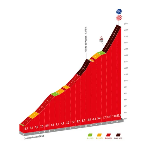 That percentage is tough in itself, but then we haven't even mentioned the immensely tricky final kilometers, where there are sometimes peaks of 24 percent! At 7.5 kilometers from the finish, a section points upwards at 11 percent, while the last 2.5 kilometers are absolutely monstrous. That section rises nearly 13 percent on average and has the aforementioned extremes just before the summit.