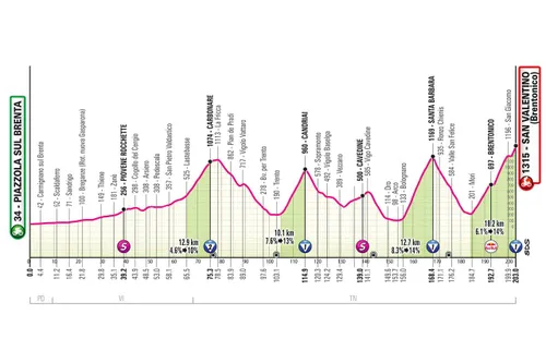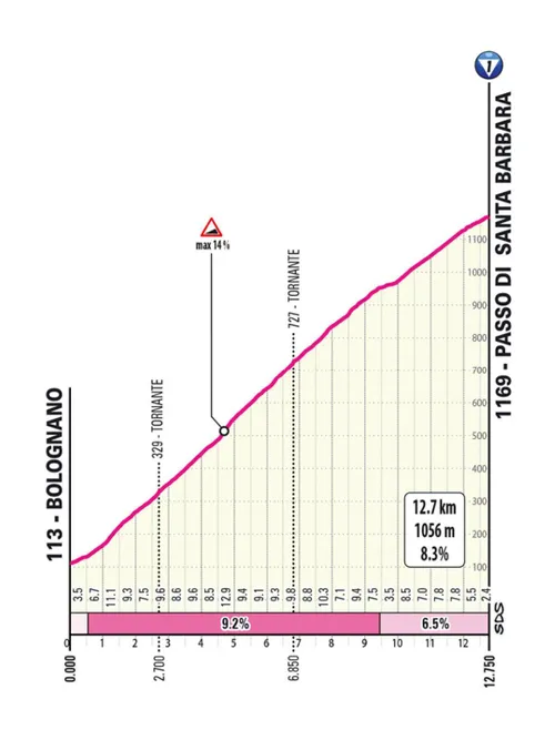 After this climb, we descend to Vezzano, where the valley section of this stage awaits. This is a 10-kilometer stretch at 2.7 percent before heading towards the Santa Barbara climb. Santa Barbara may remind you of the sunny city in California, USA. Still, this time, it is a nasty Giro climb: 12.6 kilometers at 8.3 percent, a percentage close to Wednesday's San Pellegrino. Unpleasantly steep!