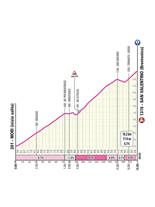 At the top of that climb, it is still 35 kilometers to the finish, the first sixteen kilometers of which are downhill towards the foot of San Valentino. That is the last mountain of the day, with variables of 18.2 kilometers at 6.1 percent. It should be noted that there are two descending sections, which means that the ascending kilometers must be steeper than the average to reach that 6.1 percent gradient.