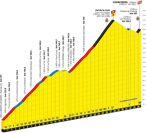 However, it pales in comparison to the last obstacle of the day: the Col de la Loze, which is gradually becoming one of the most feared mountain passes in France. It stretches for a staggering 28 kilometers with an average gradient of six percent, but once again, there are flatter sections along the way. However, these are more than compensated for by the final five kilometers of the climb, which are consistently steep. Additionally, bonus seconds are up for grabs at the summit.