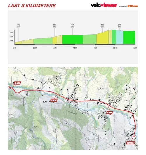 Just south of the capital Bern, the riders then have to tackle the Heitenried (1.5 km at 7.0%, after 140 kilometers) and Rechthalten (1.6 km at 6.1%, after 160 kilometers), after which the road continues to climb until the finish at Schwarzsee. This is a bit varied, as shown in the image below. In the final kilometers, ascending, flat, and descending sections alternate.