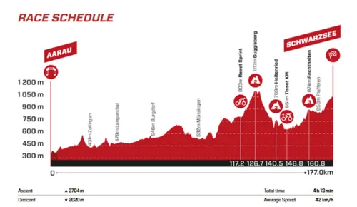 Although the riders will have to return to Aarau before the start of Tuesday's stage, the organizers have opted to head southwest in a straight line. The first hundred kilometers are relatively flat, at least by Swiss standards.