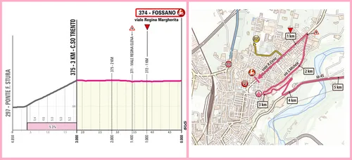 Positioning is always important in a sprint stage, but perhaps it's even more crucial in finales like these. Why? Because there are several critical points: first, the intermediate sprint in Cherasco, twenty kilometers out from the finish, then the point at Salmour, followed by the descent at eight kilometers from the finish, then the climb at 4.5 kilometers from the finish, and finally, of course, the final sprint.