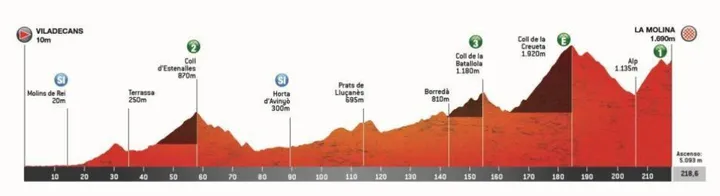 The first 180 kilometers of the stage are mainly uphill, with the Coll de la Creueta (20.3 km at 5.1%) as the final climb. Before that, the riders must climb the Coll d'Estenalles (13.3 km at 3.9%) and Coll de la Batallola (7.0 km at 3.4%). These are not extremely difficult climbs, but they will certainly take their toll on the riders' legs and lungs by the end of the day.