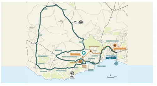After about ten kilometers, the peloton turns around, via Gáe, now heading in a southern direction on the way back. After several roundabouts, we again take the road towards Albufeira, where the coast comes into view once more. Cycling over undulating roads, after 16.9 kilometers the second intermediate point follows. There are two noteworthy bends (five hundred meters at 5.2 percent) between that point and the finish line on the east side of Albufeira.