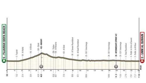 UAE Tour. Covering 181 kilometers, the route takes the peloton from Fujairah Qidfa Beach to Umm al-Quwain. There is a small climb early in the stage, but no KOM points are awarded—only an intermediate sprint. After that, it’s all slightly downhill or flat. The finish is also straightforward, without any hidden challenges like the uphill drag in Stage 1—Thursday will be all about pure speed.