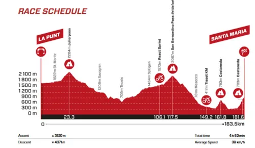 From La Punt, the route heads toward Sankt Moritz, then quickly begins the Julier Pass. This climb is 7.3 kilometers long with an average gradient of 6.5 percent, but riders are rewarded with a 50-kilometer descent afterward.