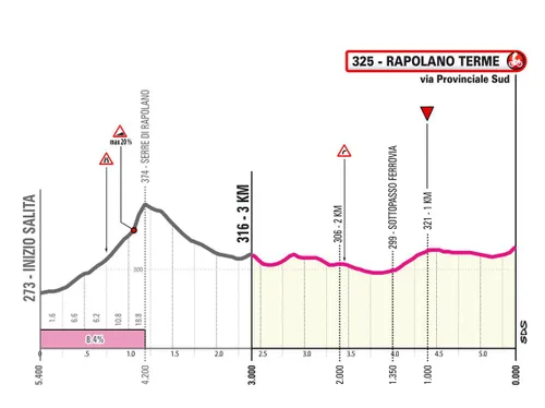 The climb, which begins just 5.4 kilometers from the finish, spans 1.2 kilometers with an average gradient of 8.4 percent. It features a narrow path where the incline peaks at a whopping 20 percent. After cresting the hill, a descent of roughly the same length leads into the final three-kilometer push through to the heart of Rapolano di Terme. The last 450 meters will challenge the peloton one last time with a 6 percent incline.