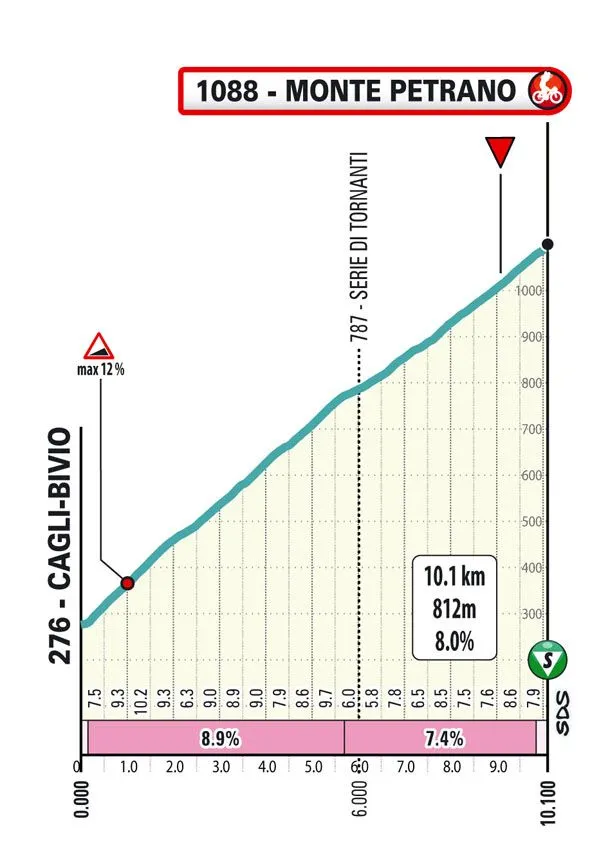 180.0 km: Monte Petrano (10.0 km at 8.0%)