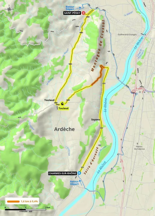 From Chames-sur-Rhône, we follow the river towards Les Freydierses, where the road climbs 1.6 kilometers at a gradient of 9.4 percent—similar to the Mur de Huy—before passing the halfway point in Toulaud.