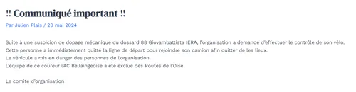 A rider in the French amateur race Route de l'Oise is suspected of having used mechanical doping. This was confirmed by the French newspaper