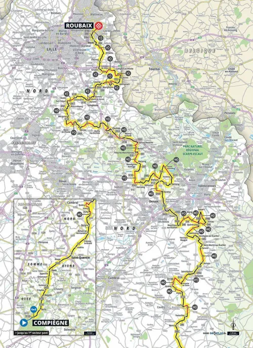 Nowadays, you must pay close attention to kilometer zero in Compiegne because, in the flattest Monument, the early breakaway can sometimes go a long way. On sections like the Trouée d'Arenberg, it is better to be ahead of the chaos than behind it, which will be emphasized during the briefings in the various team buses. After one hundred kilometers, the riders reach cobblestone section one, following each other rapidly.