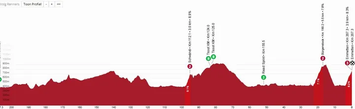 After the descent and a longer flat section, the riders will tackle the second-category Bürgenstock. This penultimate climb is 5.5 kilometers long at an average gradient of 7.9 percent. The second kilometer is the toughest, averaging over 10 percent. Following a fast descent, the final climb to Emmetten begins (3.9 km at 8.1 percent). It starts off brutally steep — the second kilometer kicks up to nearly 13 (!) percent — before easing slightly toward the end, with the last kilometer coming in at just under six percent.