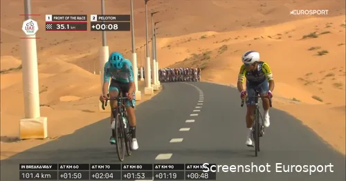 At the start of the first stage, which began in a field full of solar panels, three men immediately set off. Manuele Tarozzi and Federico Biagini (both VF Group - Bardiani CSF - Faizanè) made it a duo time trial, although they were also joined by the Panamanian Carlos Samudio (Team Solution Tech - Vini Fantini). The three of them set off on an adventure in the high winds of the desert, where they built up a lead of up to three minutes. However, The sprinters' teams were eager for a final sprint, so they were gradually caught up.