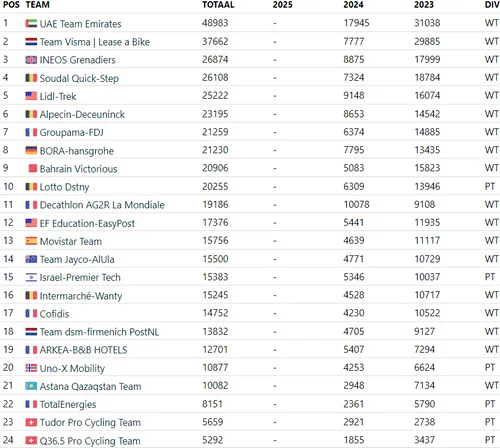 triennial reckoning, or the promotion-relegation system. Lotto-Dstny and Israel-Premier Tech dropped out of the WorldTour at the end of 2022, but the spots will be redistributed at the end of 2025. Now that we are almost halfway through that cycle, more and more teams are starting to feel the need to keep a closer eye on the rankings.