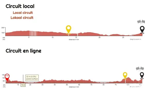 After the day's first climb, the riders will tackle the short Côte des Nonettes and head to the Rue de Belle Vue. From there, the race continues to the finish line in Dour. The next obstacle is the Rue du Vert Pignon, a relatively long cobblestone section. Then, the riders hit the Rue Chasse de la Motte, a cobblestone climb, after which they continue to the Côte de la Roquette, completing the lap.
