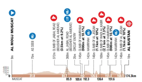 The race starts in Al Mouj Muscat and finishes in Al Bustan, on the opposite side of the city. The approach is predominantly flat, allowing breakaways to form early on in the race, but around halfway through the race, it is time to start climbing. Just like last year, riders must conquer six categorized climbs. Except for the first climb of the day, the Jabal Road (3.5 kilometers, 9.2 percent), the climbs closely resemble each other: they are all barely a kilometer long but very steep. The summit of the Al Jissah climb (1.1 kilometers, 10 percent), which is the only one that the riders will need to climb twice, is however only four kilometers from the finish. Which does not leave much time to catch up from the back of the pack!