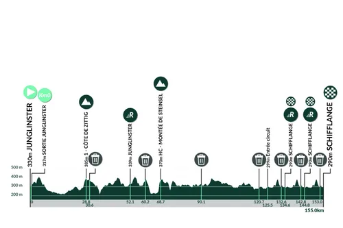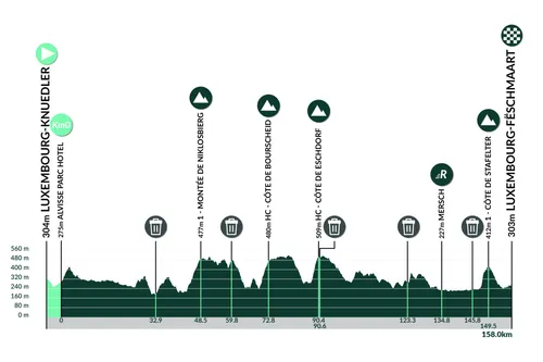 A traditional opening stage, with both the start and finish in Luxembourg City. There will be some tough climbing right away, with short, steep climbs. In the final part, the CĂ´te de Stafelter will cause splits in the peloton, before an uphill finish.