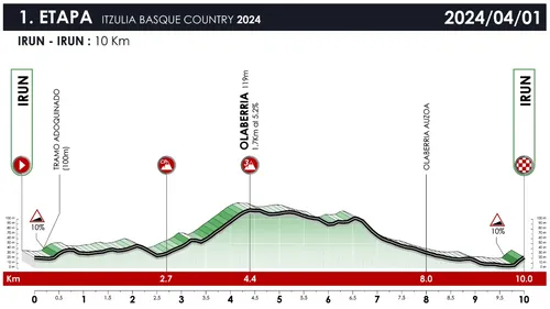 The Tour of the Basque Country kicks off with a ten-kilometer individual time trial in and around Irun. We can call this anything but easy: just after the start, there is a stretch at ten percent on cobblestones, followed fairly quickly by the ascent of Olaberria (1.7 kilometers at 5.2 percent). From the summit, it is about five kilometers downhill before the last few hundred meters also incline upwards.