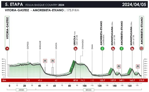 Stage 5 of the Tour of the Basque Country starts in Vitoria-Gasteiz, following a relatively gentle opening stage. However, things change dramatically from Urkiola, a 5.5-kilometer climb with an average gradient of almost ten percent. In the final stage, the route includes two additional local circuits in and around the finish town of Amorebieta-Etxano, featuring the Muniketagaina climb (3.5 km at 7.5%).