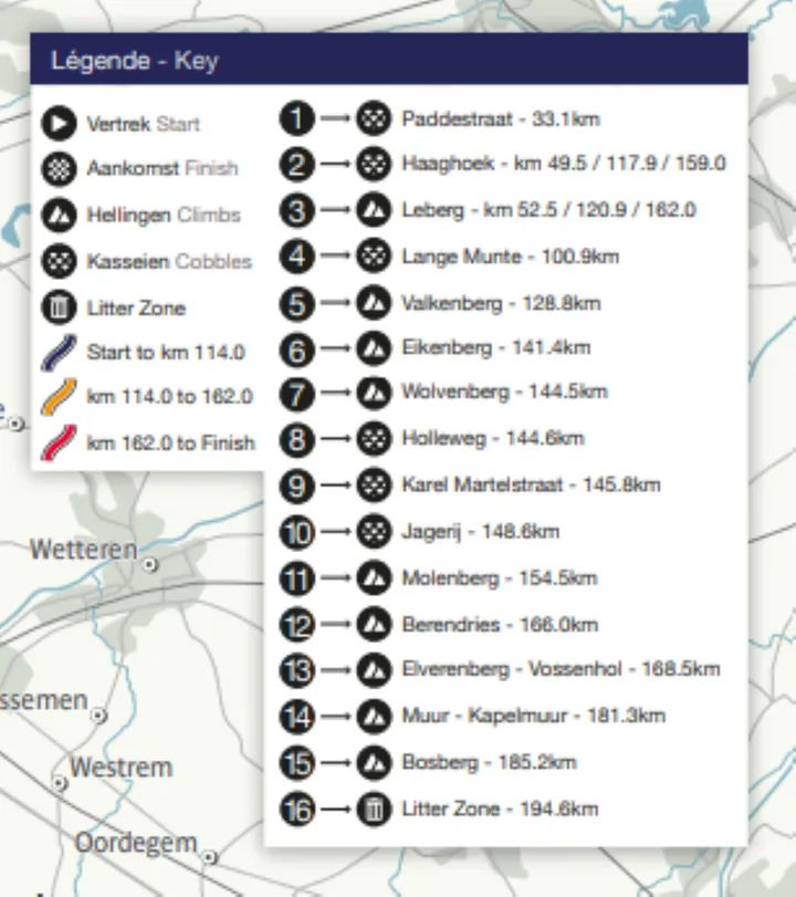 Halfway through the race, we arrive in the Flemish Ardennes, with the Lange Munte, Leberg, and Valkenbeg in succession. With about fifty kilometers to go, the Eikenberg/Wolvenberg combination is often the starting point of the last part of the race, especially since the cobblestone sections of Holleweg and Kerkgate/Jagerij follow fairly quickly. We are now approaching the final hour of the race.