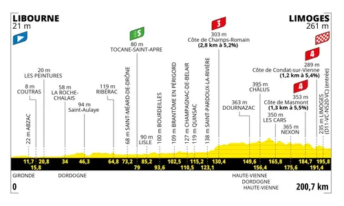 The second weekend in the Tour will be an interesting spectacle. In the first stage over 200 kilometers, the finale is one that could go either way. Two short climbs could still launch things. If not, we're headed for a fourth bunch sprint in this first week. After all, the finishing road in Limoges is flat.