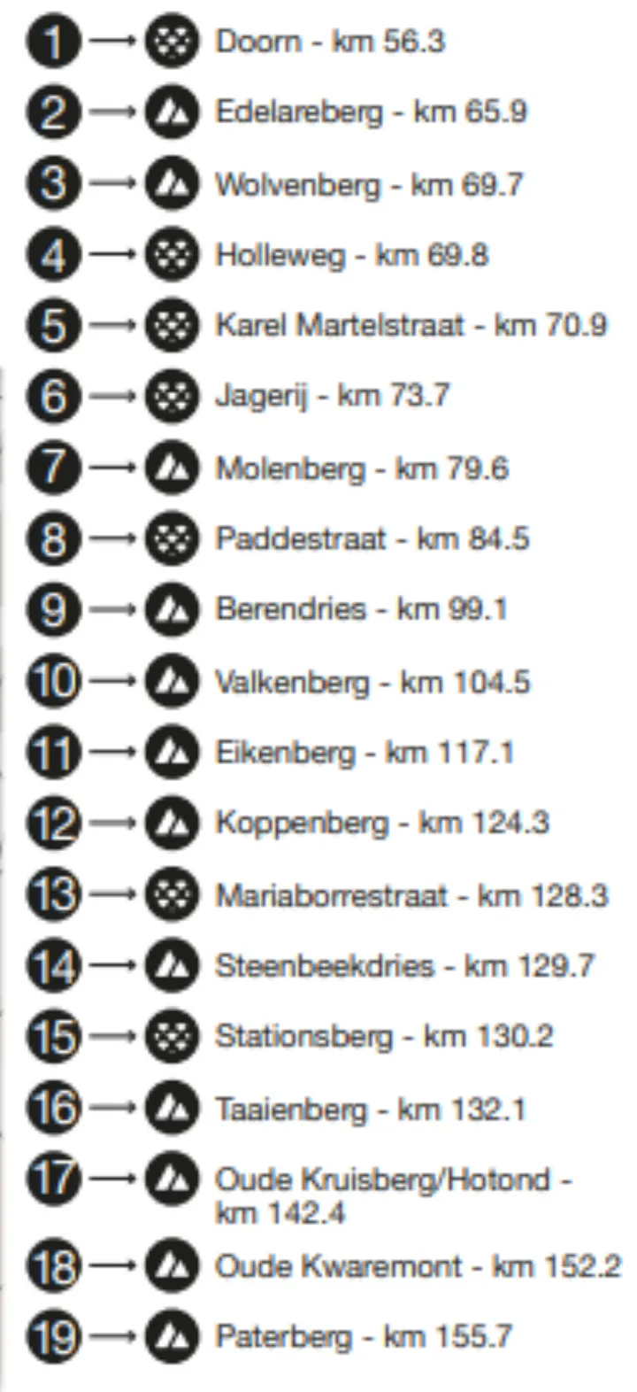 After seventy flat kilometers, the ladies reach the hilly zone, which starts with the Wolvenberg. Fifteen kilometers later, they hit the Molenberg, Marlbouroughstaart, Berendries, and Valkenberg before there is some time to catch their breath until the super-heavy Koppenberg, 45 kilometers from the finish.