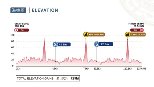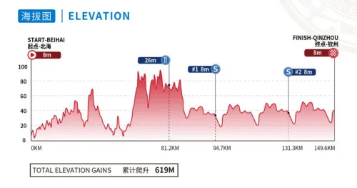 On the second day, we depart from the same location as Thursday, Beihai. The stage takes us towards Qinzhou, and it's a relatively flat route with minimal elevation changes, totaling only 619 meters. This suggests that, for the second consecutive day, we can anticipate a bunch sprint finish.