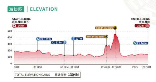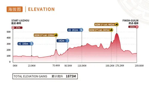We conclude this race in Guilin, featuring a 168.3-kilometer stage on the program. This stage is expected to culminate in another sprint finish, with two climbs to be tackled in the second half.