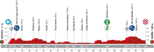 On the second day, the peloton moves from Cascais to Ourem, leaving the coastal area for Portugal's interior. About twenty kilometers from the finish, the Alto da Batalha (7.1 km at 3.3%) awaits, but stronger sprinters should manage this climb.