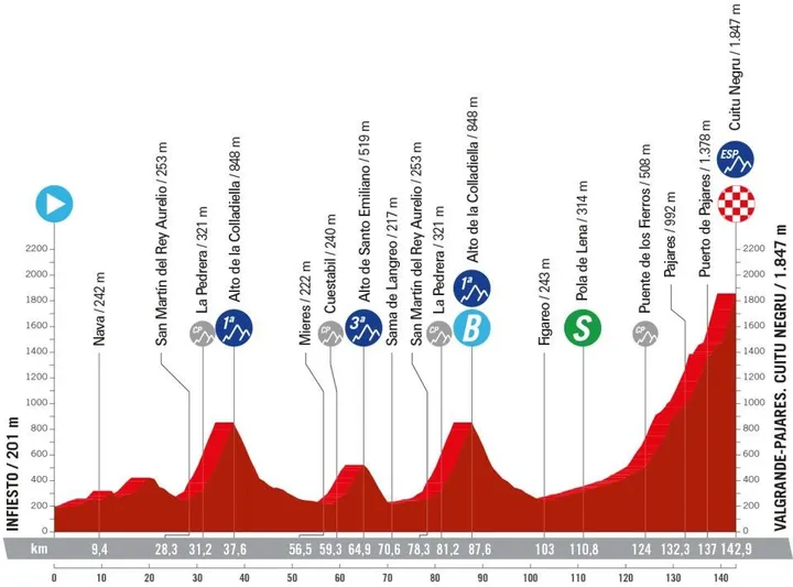 Stage 15, Sunday, Sept. 1: Infiesto - Valgrande-Pajares Cuitu Negru (142.9 km)