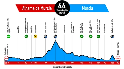 The course for the 2024 edition has seen some changes. For instance, this year's start is in Primafrio, not San Javier, and the finish in the narrow, ascending streets of Parque Torres is no more. Starting out, there's a loop to the south. This leads to a much flatter start this year, with the two hills at the beginning of the race gone. The race is also five kilometers longer than last year: a little under 199 kilometers in total. However, the Alto Collado Bermejo remains the decisive factor. This first-category climb forms a two-stage challenge with the third-category Alto de Aledo this year. The climb is not too steep but peaks above 1100 meters, presenting an early opportunity to drop the sprinters that can climb.