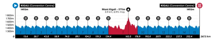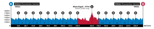 The road race for the elite men starts at 9:20 AM for good reason, because with 267.5 kilometers and no less than 5,475 (!) meters of climbing, the riders will not finish until around 4:35 PM, and an hour later, it will already be dark in Rwanda at this time of year. The start and finish are planned in Kigali, with Mont Kigali (5.9 kilometers at 5.6 percent) as the decisive climb in the middle of the race.
