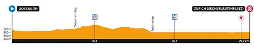 The following eight kilometers are also hilly, but then it's in one long, straight line of about 15 kilometers pedaling along Lake Zurich. Here, they also time it again, after 20.5 kilometers. We arrive—as in all races—at the Sechseläutzenplatz. kilometer, the riders have a few kilometers on it at a five percent average.