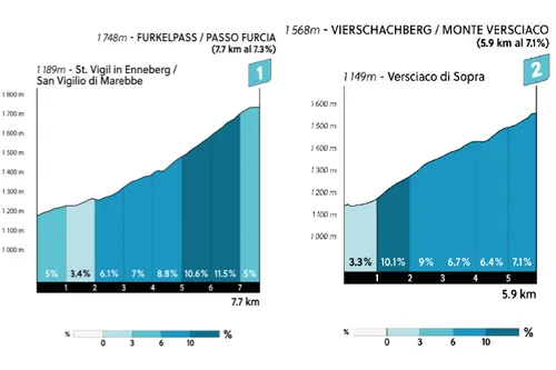 Then there’s a further kicker of 2.6 km at 5.5%, also uncategorized. The official climbing begins only at the base of the Passo Furcia, a tough ascent of 7.7 km at 7.3% average, maxing out at 11.5%, with the real sting in the second half. But since the summit lies 55 km from the finish, it may not trigger early attacks. After descending, the route heads uphill again via a false flat toward the final climb of the day: Monte Versciaco. At 5.9 km with a 7.1% average gradient, it’s a solid challenge, especially because the toughest part comes right at the beginning.