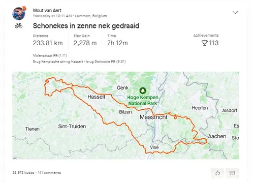 Van Aert skipped the celebrations in Paris after teammate Jonas Vingegaard's Tour win, but quickly got back into his routine to prepare for the World Championships. On Monday, he cycled from his house to the three country point between the Netherlands, Belgium and Germany on the Vaalserberg - a journey of a whopping 234 (!) kilometers, which he completed in seven hours and twelve minutes. Looking promising, Wout!