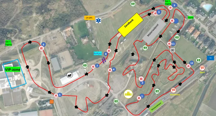 After a first run through the pit area, the peloton moves to the westernmost part of the course, right next to the indoor tennis court, where the VIP area has also been established. Barriers and a second passage through the sand follow. A final loop, with another crossing through the pit area, brings the riders back to the finish line.